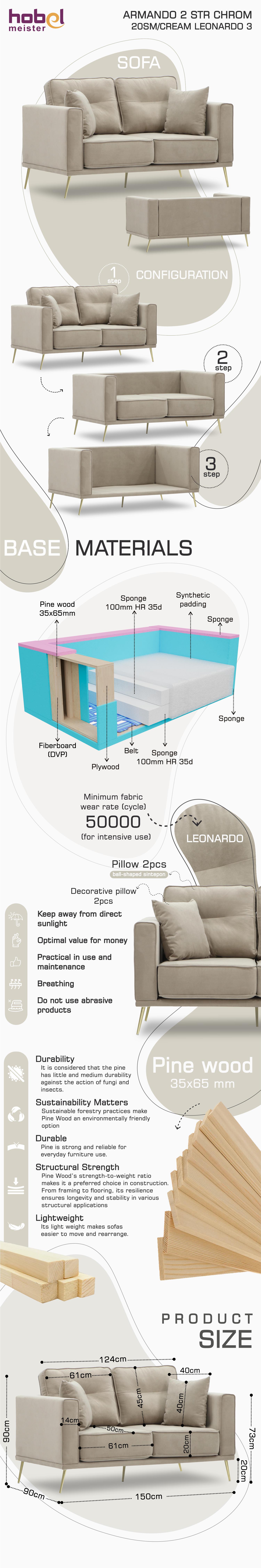 ძირითადი ატრიბუტები დივანი HOBEL ARMANDO 2 STR CHROM 20SM/CREAM LEONARDO 3 (1)