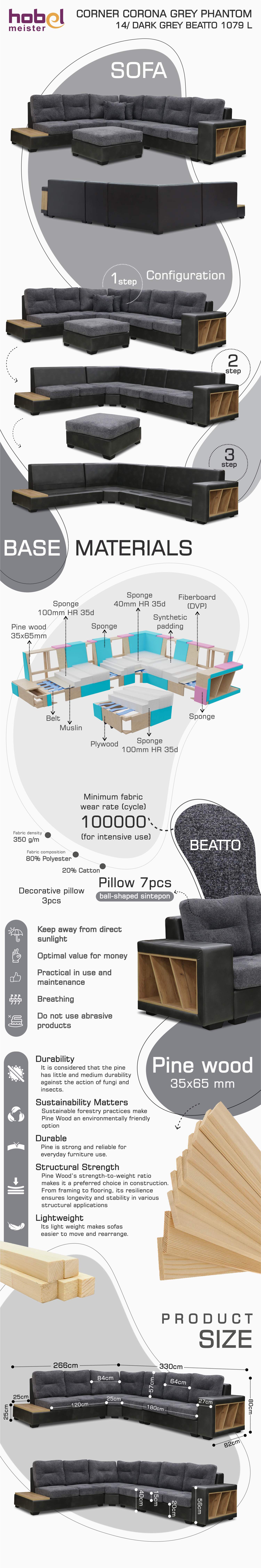 ძირითადი ატრიბუტები დივანი HOBEL CORNER CORONA GREY PHANTOM 14/ DARK GREY BEATTO 1079 L (7)