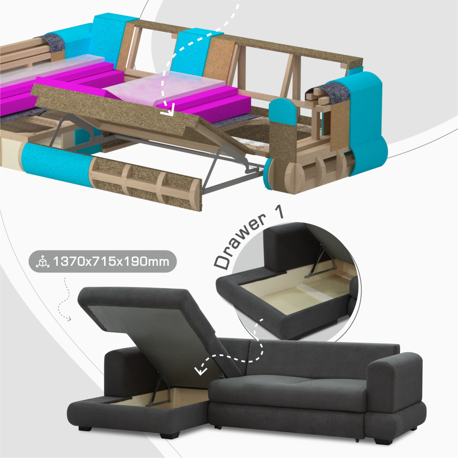 პროდუქტის აღწერა დივანი HOBEL CORNER SIDNEY PLUS DARK GREY BUKLE 15 L (3)