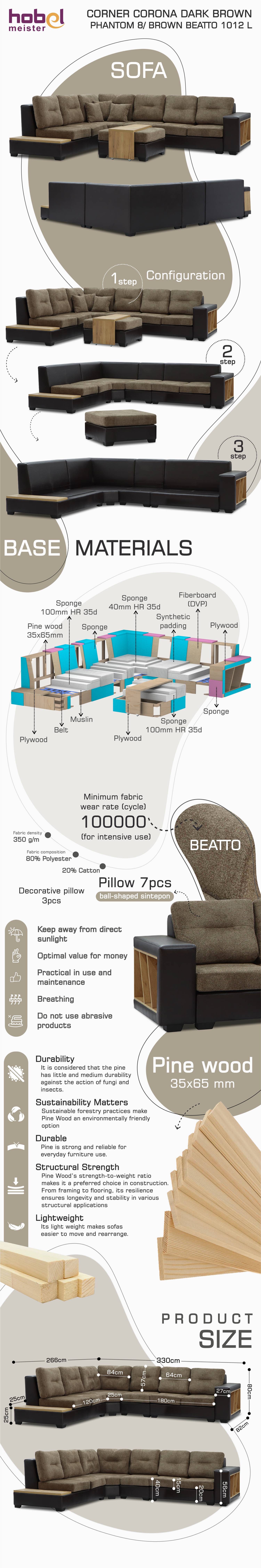 Основные характеристики диван HOBEL CORNER CORONA DARK BROWN PHANTOM 8/ BROWN BEATTO 1012 L (7)